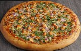 Spicy tikka sauce, layered with marinated chicken, mozzarella cheese, red onions, green bell pepper, jalapeño, black olives and garnished with fresh cilantro