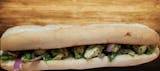 Pesto sauce, marinated chicken breast, red onions, green peppers and mozzarella cheese.