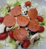 Iceberg lettuce, cherry tomatoes, red onions, green peppers, fresh mushrooms, green olives, black olives, pepperoni and mozzarella cheese, served with Italian dressing.